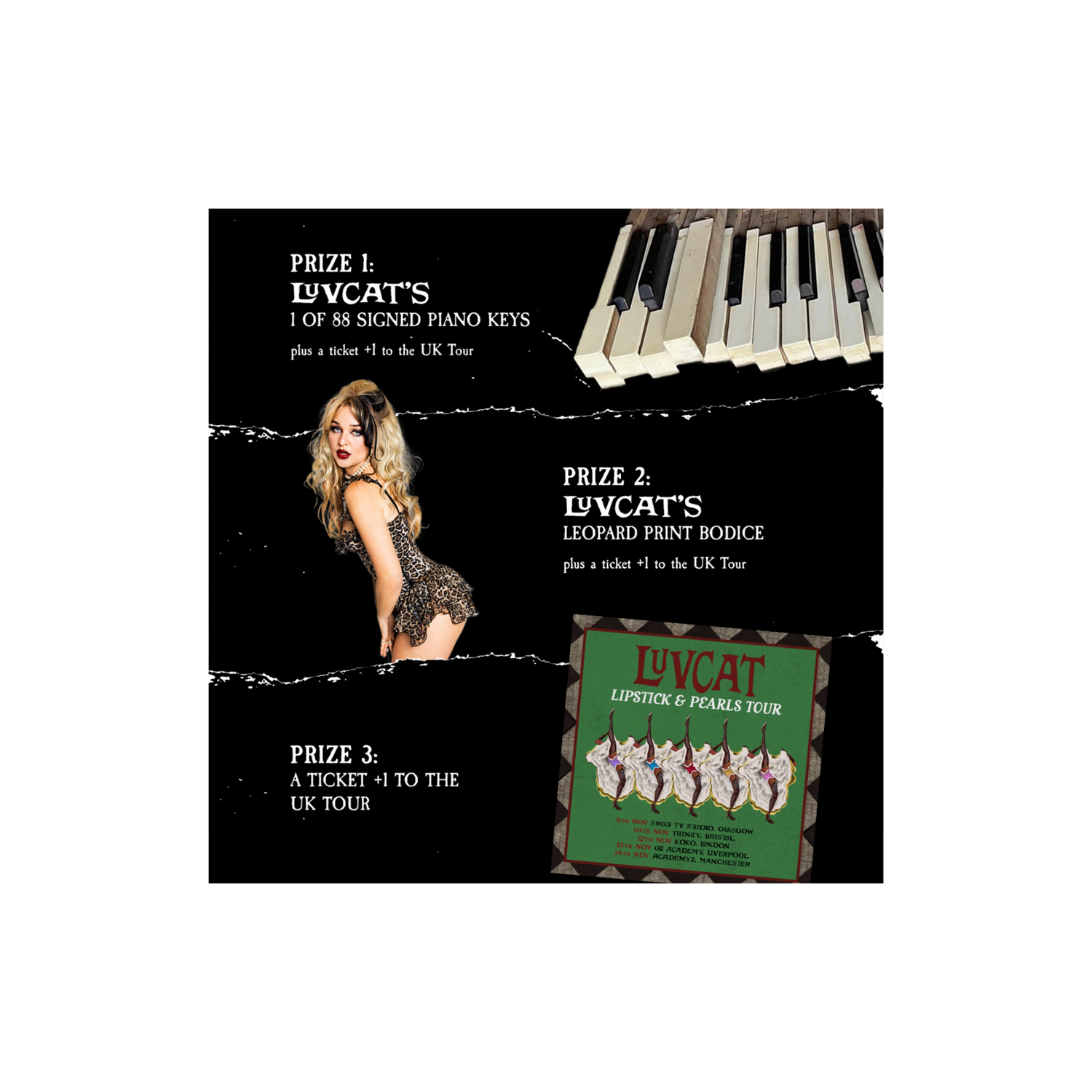 1) a signed piano key from Luvcat's old upright piano plus a ticket +1 to any UK show